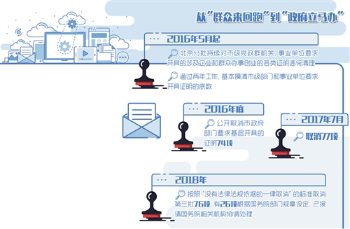 不久前,北京在此前分兩批取消151項市級部門設定的企業(yè)群眾辦事創(chuàng)業(yè)證明基礎上,再次取消76項證明事項,涉及企業(yè)設立、經(jīng)營許可、困難救助、就讀升學等各方面。