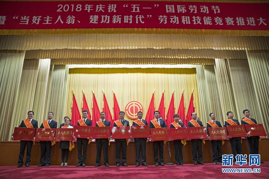4月28日,榮獲全國工人先鋒號的部分集體代表在大會上合影。當日,2018年慶祝“五一”國際勞動節暨“當好主人翁、建功新時代”勞動和技能競賽推進大會在北京人民大會堂舉行。 新華社記者 才揚 攝