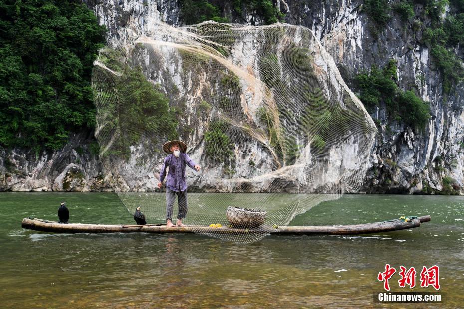 79歲的黃月創正在表演漓江傳統漁事。中新社記者 俞靖 攝