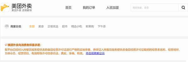 從哪里看違規餐飲店鋪公示情況?首先,打開三個外賣平臺的網頁版并登陸,選擇“北京地區”后,可以看到網頁最上端明顯位置發布了這樣的承諾:“我平臺已經對入網餐飲服務提供者的食品經營許可證進行嚴格的實地審查,并保證入網餐飲服務提供者食品經營許可證載明的經營者名稱、經營場所、主體業態、經營項目、有效期等許可信息合法、真實、準確、有效?!?/p>
