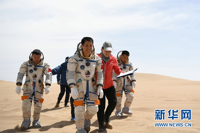 5月17日,航天員聶海勝(右三)、劉旺(左一)和張曉光(右一)在工作人員護(hù)送下前往沙漠進(jìn)行野外生存訓(xùn)練。 15名中國航天員日前在巴丹吉林沙漠圓滿完成了野外生存訓(xùn)練。這是我國首次在著陸場區(qū)沙漠地域組織的航天員野外生存訓(xùn)練。據(jù)介紹,航天員沙漠野外生存訓(xùn)練為期19天,由中國航天員中心組織,酒泉衛(wèi)星發(fā)射中心提供訓(xùn)練保障。訓(xùn)練主要針對(duì)空間站載人航天飛行任務(wù)飛船應(yīng)急返回著陸沙漠地域特殊情況,旨在使航天員進(jìn)一步掌握救生物品的使用方法,提高沙漠環(huán)境生存能力,鍛煉意志品質(zhì),增強(qiáng)團(tuán)隊(duì)協(xié)作和凝聚力。新華社記者 陳斌 攝