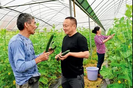 福建省武夷山市上梅鄉首陽村黨支部書記、村主任左承基(中)在農民創業園的大棚內了解蔬菜種植情況 張國俊攝/本刊