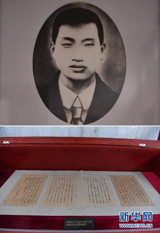拼版照片:上圖為陳覺像;下圖為湖南省長沙市烈士公園展出的陳覺烈士寫給妻子趙云霄的遺書(5月7日攝)。新華社發