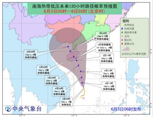 預計,低壓中心將以每小時10公里左右的速度向偏北方向移動,強度逐漸加強,將于3日白天到夜間發展為今年第4號臺風(熱帶風暴級),并逐漸向海南島東部一帶沿海靠近。