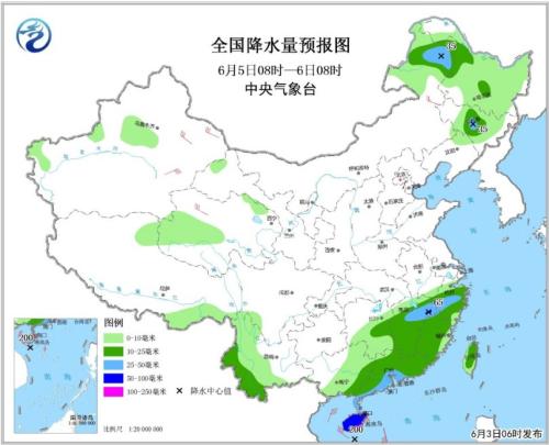 6月5日08時至6日08時,華南南部有較強降水。內蒙古東北部、東北北部和東部、江南中東部、華南東南部、云南西部等地有中到大雨,其中廣東南部沿海及海南島等地的部分地區有暴雨,局地大暴雨(100~200毫米),上述局部地區將伴有短時強降水等強對流天氣。新疆東北部、青海西北部、內蒙古北部、海南等地的部分地區有4~6級風,局地陣風7級。南海中西部和西北部海域將有7~9級、陣風10級的旋轉風。