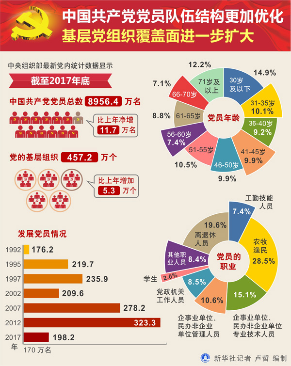 截至2017年12月31日,中國共產黨黨員總數為8956.4萬名,比上年凈增11.7萬名,增幅為0.1%。