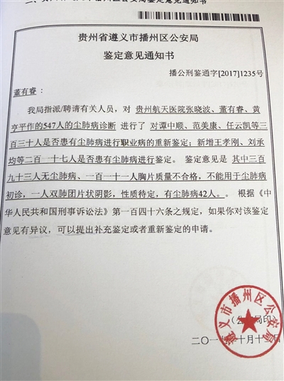 張曉波的妻子董捷告訴記者,辦案機(jī)關(guān)認(rèn)定三位醫(yī)生“失職罪”的主要依據(jù)是一份鑒定通知書(shū)。2017年10月12日,貴州省遵義市播州區(qū)公安局下達(dá)鑒定意見(jiàn)通知書(shū),稱指派有關(guān)人員對(duì)張曉波、董有睿、黃亨平做的547人的塵肺病診斷進(jìn)行了重新鑒定。鑒定意見(jiàn)為其中393人無(wú)塵肺病、111人胸片質(zhì)量不合格,不能用于塵肺病初診;一人性質(zhì)待定;有塵肺病42人。