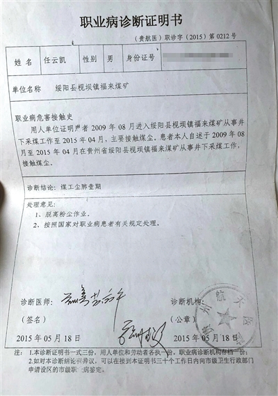 2015年5月18日,任云凱拿到了貴州航天醫(yī)院開(kāi)具的職業(yè)病診斷證明書(shū),診斷結(jié)論為煤工塵肺壹期。
