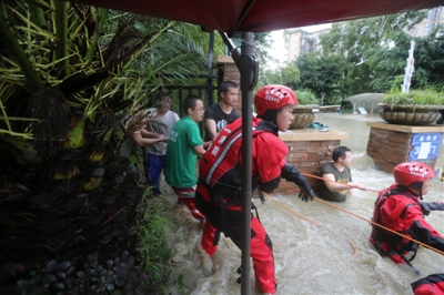 盡管渾身濕透,冷得瑟瑟發抖,但他們沒有離開之意,各自緊緊握住手中的繩子,喊著節奏,與3名消防員一起,營救著十余米外的多名被困者。