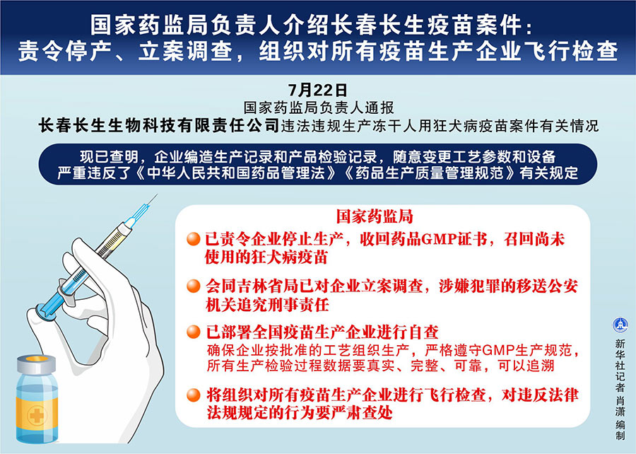 新華社北京7月22日電(記者齊中熙、趙文君)國(guó)家藥監(jiān)局負(fù)責(zé)人22日通報(bào)長(zhǎng)春長(zhǎng)生生物科技有限責(zé)任公司違法違規(guī)生產(chǎn)凍干人用狂犬病疫苗案件有關(guān)情況。這位負(fù)責(zé)人說(shuō),國(guó)家藥監(jiān)局已責(zé)令企業(yè)停止生產(chǎn),收回藥品GMP證書(shū),同時(shí)會(huì)同吉林省局已對(duì)企業(yè)立案調(diào)查,涉嫌犯罪的移送公安機(jī)關(guān)追究刑事責(zé)任。國(guó)家藥監(jiān)局將組織對(duì)所有疫苗生產(chǎn)企業(yè)進(jìn)行飛行檢查,對(duì)違反法律法規(guī)規(guī)定的行為要嚴(yán)肅查處。