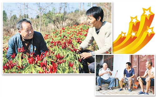左上圖 張東堂(左)在貧困戶家的辣椒地里查看辣椒長勢。 右下圖 張東堂(左一)來到貧困戶家中家訪。 經(jīng)濟日報-中國經(jīng)濟網(wǎng)記者 郭靜原攝