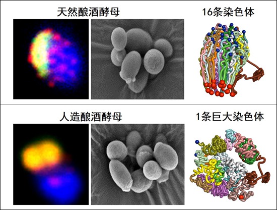 人造單染色體酵母與天然酵母細(xì)胞對比圖,兩者形態(tài)相似,但染色體的三維結(jié)構(gòu)有巨大改變。中國科學(xué)院分子植物科學(xué)卓越創(chuàng)新中心/植物生理生態(tài)研究所供圖