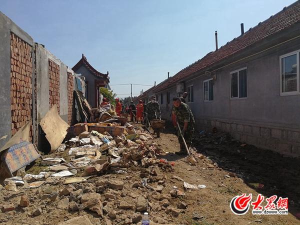在口子村,消防官兵和當地干部群眾正在和即將到來的暴雨搶時間。大眾網記者從現場看到,雖然洪水已經退去,但是房屋外墻上依然殘留著未干透的水漬。