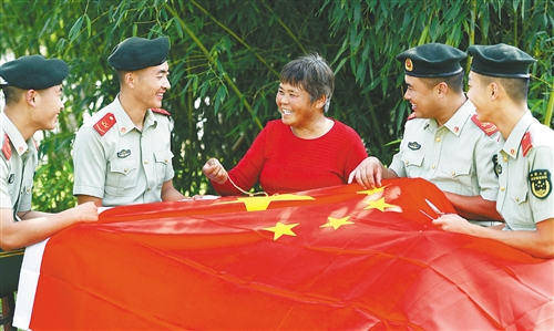 圖⑧ 9月29日,武警安徽總隊(duì)合肥支隊(duì)十七中隊(duì)邀請(qǐng)駐地“兵媽媽”張益蘭到軍營(yíng),與官兵一起繡國(guó)旗、唱國(guó)歌,迎國(guó)慶。徐偉 攝