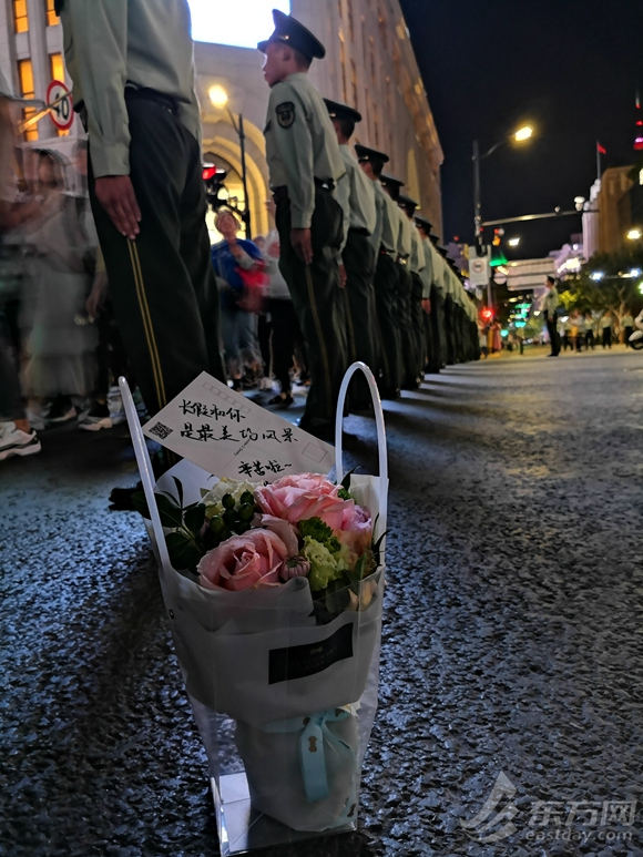 10月4日晚21時10分,在南京路步行街十字路口,一位姑娘手捧鮮花走執勤官兵面前:“辛苦你們,這束花送給你們!”放下轉身便消失在人群之中。當執勤官兵拿起鮮花時驚喜地發現,里面還夾了一張特制的明信片,娟秀的字跡寫到:“長假和你,是最美麗的風景。辛苦啦~比心~”