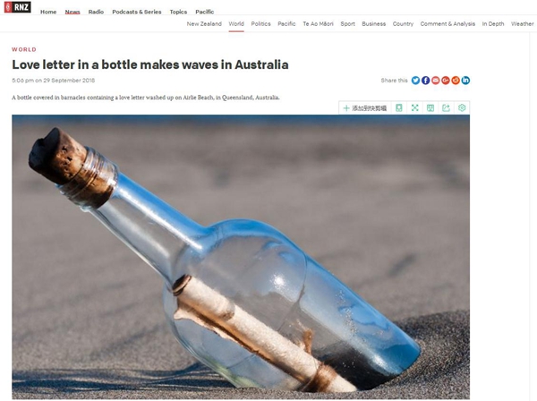 9月29日,新西蘭廣播電臺(RNZ)轉載了英國廣播公司的這篇報道,稱中國海員的這封情書已經在澳大利亞引起轟動。