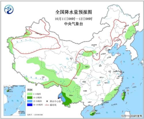 10月11日08時至12日08時,黑龍江東南部、吉林東部、新疆西部、西藏北部和東部等地有小到中雨(雪)或雨夾雪;西北地區東部、四川南部、云南大部、貴州西部、華南東部、海南島和臺灣島等地部分地區有小到中雨,其中,云南西部、海南島南部、臺灣東北部等地局地有大雨或暴雨(50~70毫米)。內蒙古中部、遼東半島、山東半島等地部分地區有4~6級風。臺灣海峽將有7~8級、陣風9級的東北風。