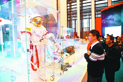 “可上九天攬月,可下五洋捉鱉”。一邊是航天技術展區,一邊是航海技術展區,完美對應著詩句,一上一下,延展著人類對于世界的認知和想象。天宮二號空間實驗室、嫦娥三號月球探測器以及蛟龍、海龍、潛龍“三龍兄弟”深海探測裝備模型,讓很多在場的孩子發出贊嘆之聲。