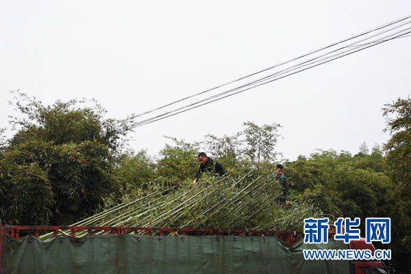 工作人員在位于重慶市大足區寶興鎮的雷竹林里裝運即將銷往外地的竹苗(11月20日攝)。新華社記者王全超攝