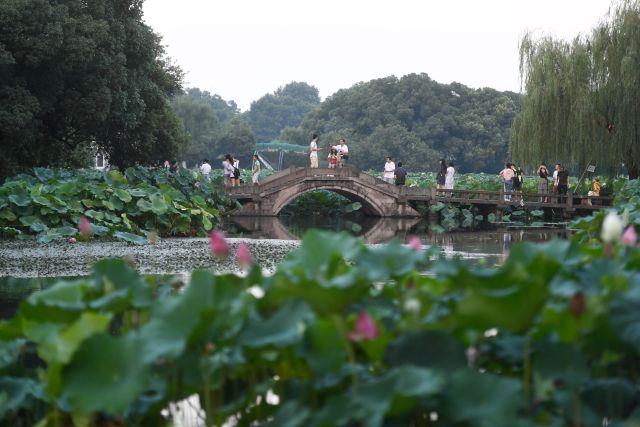 游客在杭州西湖曲院風荷景區(qū)觀賞荷花 ( 黃宗治/攝 )