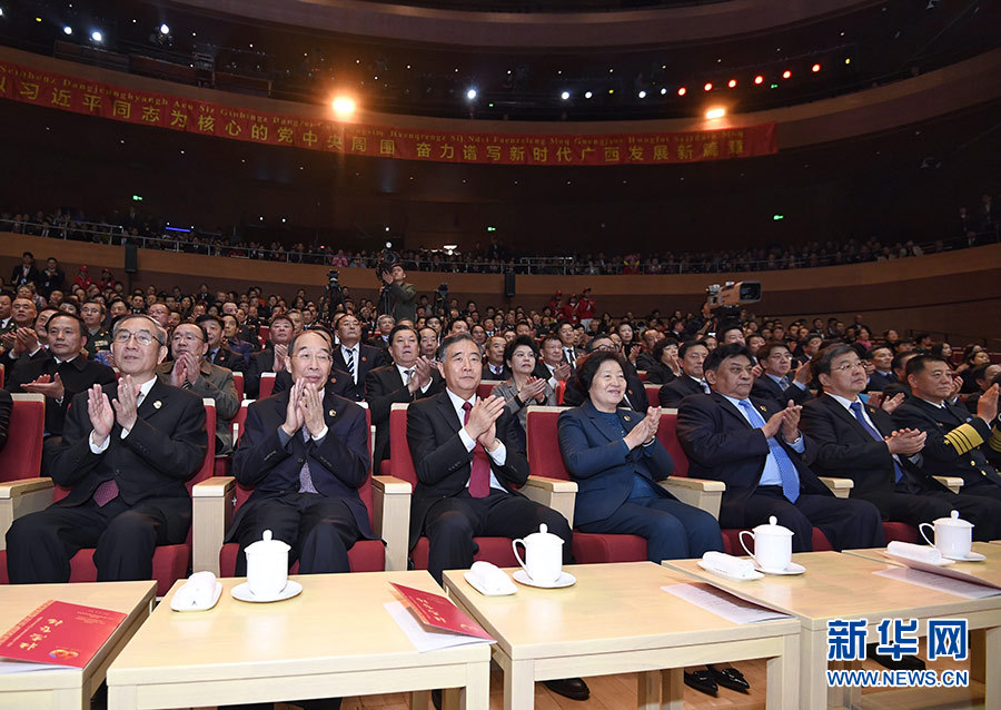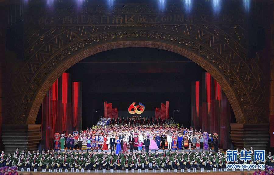 12月9日,慶祝廣西壯族自治區成立60周年文藝晚會《壯志飛揚》在廣西文化藝術中心精彩上演。中共中央政治局常委、全國政協主席、中央代表團團長汪洋和各族各界干部群眾等近900人觀看演出。 新華社記者 申宏 攝