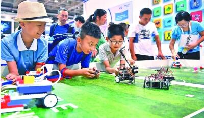 2018世界機器人大會上,小學生在焊接用于編程的模塊。新華社發