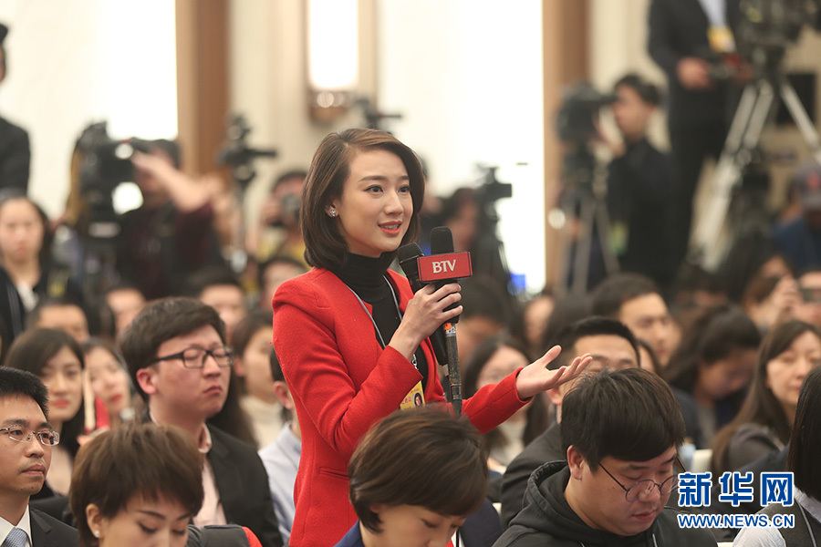 全國政協十三屆一次會議新聞發布會3月2日16:30在人民大會堂一層新聞發布廳召開,大會新聞發言人王國慶向中外媒體介紹本次大會有關情況并回答記者提問。圖為北京電視臺記者提問。新華網/中國政府網 曲植 攝