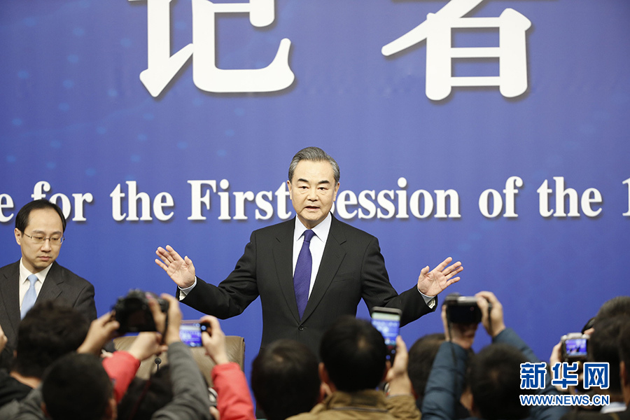 十三屆全國(guó)人大一次會(huì)議新聞中心于3月8日上午10時(shí)在梅地亞中心多功能廳舉行記者會(huì),邀請(qǐng)外交部部長(zhǎng)王毅就“中國(guó)外交政策和對(duì)外關(guān)系”回答中外記者提問。圖為王毅向記者示意。新華網(wǎng)/中國(guó)政府網(wǎng)陳杰 攝