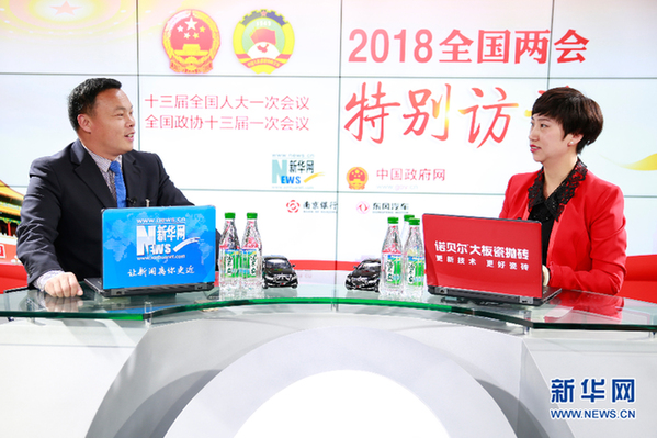 圖為全國人大代表、河南省平頂山市寶豐縣大黃村黨支部書記馬豹子做客新華網(wǎng)2018全國兩會特別訪談 新華網(wǎng) 范作言 攝
