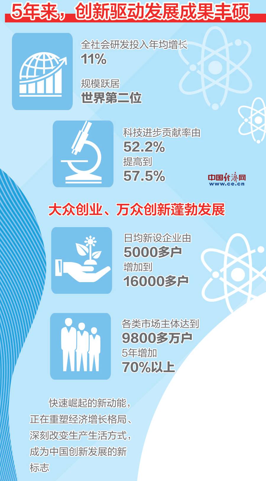 這5年,創(chuàng)新驅動發(fā)展成果豐碩。全社會研發(fā)投入年均增長11%,規(guī)模躍居世界第二位;科技進步貢獻率提高了5.3個百分點;載人航天、深海探測、量子通信、大飛機等重大創(chuàng)新成果不斷涌現;高鐵網絡、電子商務、移動支付、共享經濟等引領世界潮流……這一切,都源于我們實施的創(chuàng)新驅動發(fā)展戰(zhàn)略。在今年兩會上,代表委員圍繞“創(chuàng)新”這個關鍵詞,有講不完的話題。