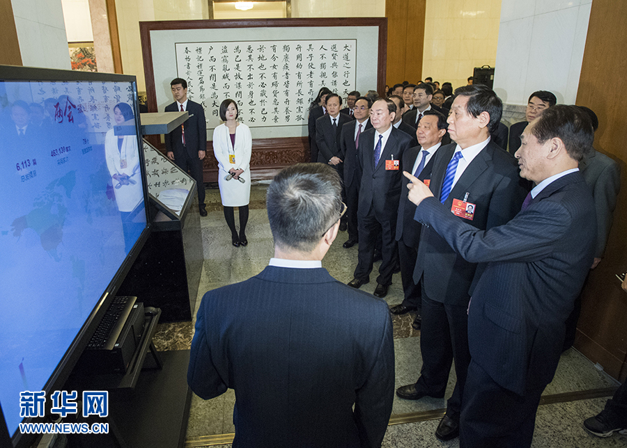隨后,栗戰書走進設在人民大會堂一樓大廳的新華社兩會新聞報道中心,仔細觀看了微視頻《誓言》、人工智能產品《“媒體大腦”帶你看憲法宣誓》、新華社兩會報道實時大數據展示、新華網“奮進新時代 筑夢新征程”兩會融媒體專題等,看望正在這里緊張工作的采編和技術人員,與參加兩會報道的新華社外籍記者親切交談。在觀看了新華社制作的融媒體產品《“90后”全國人大代表程桔:小丫回村當書記》后,栗戰書對新聞媒體創新兩會報道給予充分肯定。