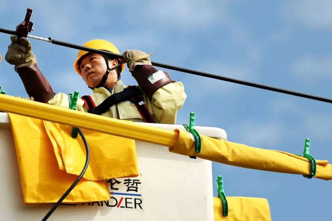 2018-09-06,山東濟南。一名電力員工專注進行線路帶電作業。作者:CBT