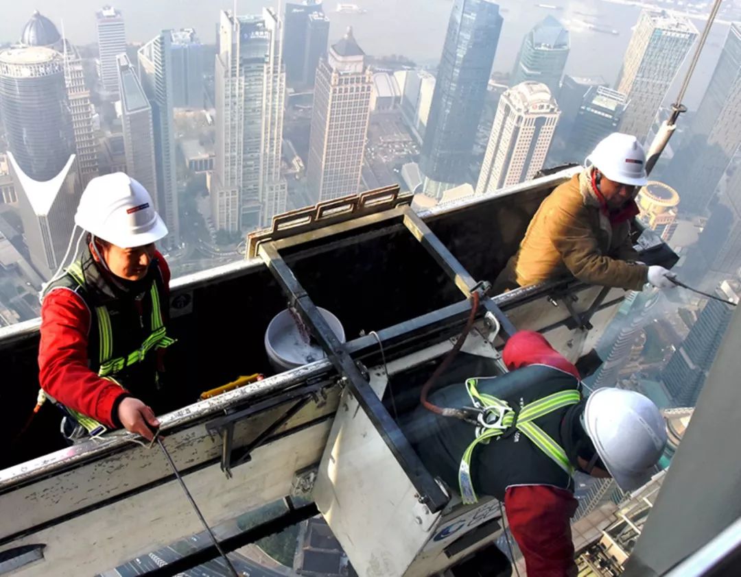 2018-12-13,上海。上海環球金融中心大廈外墻450米高空作業的清潔工,被陸家嘴金融中心眾多高大樓宇包圍,成了“中心”之中的中心。作者:孫家錄