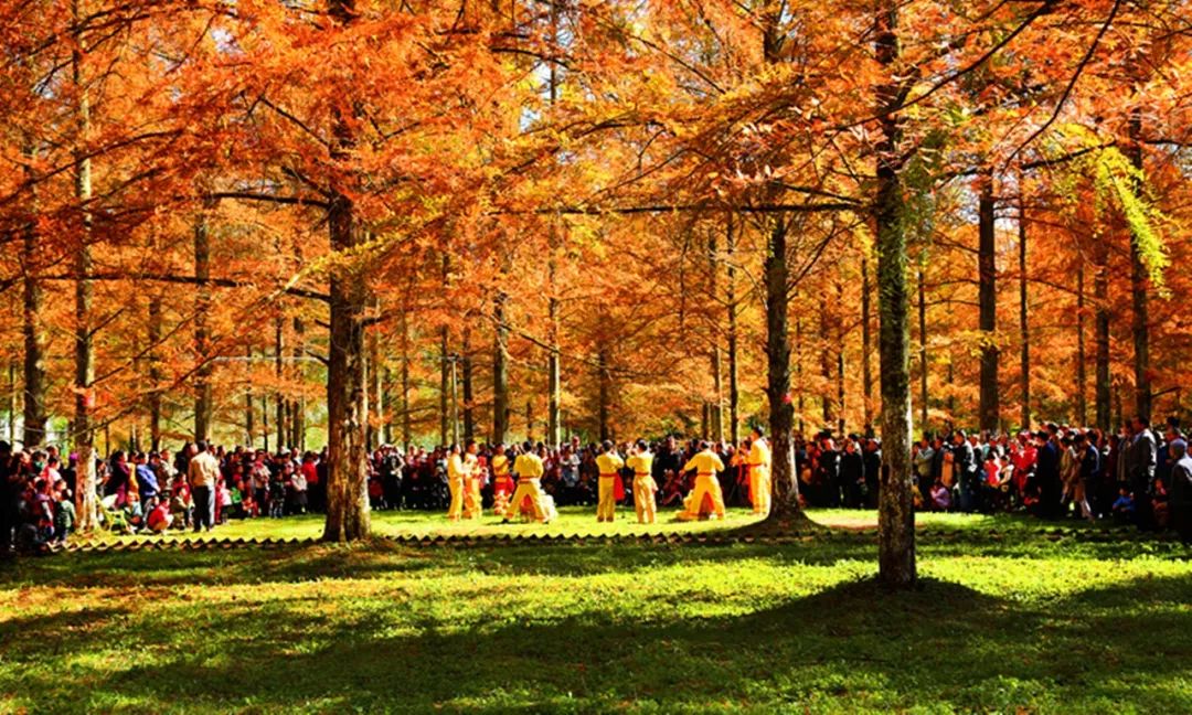 2018-11-03,湖北利川。金色的水杉林里滿是尋秋賞秋的人。作者:福葉依斯李傳書