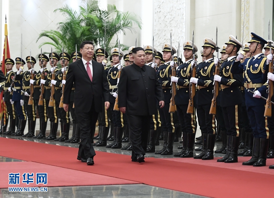 1月8日,中共中央總書記、國家主席習(xí)近平同當(dāng)日抵京的朝鮮勞動黨委員長、國務(wù)委員會委員長金正恩舉行會談。會談前,習(xí)近平在人民大會堂北大廳為金正恩舉行歡迎儀式。 新華社記者 黃敬文 攝