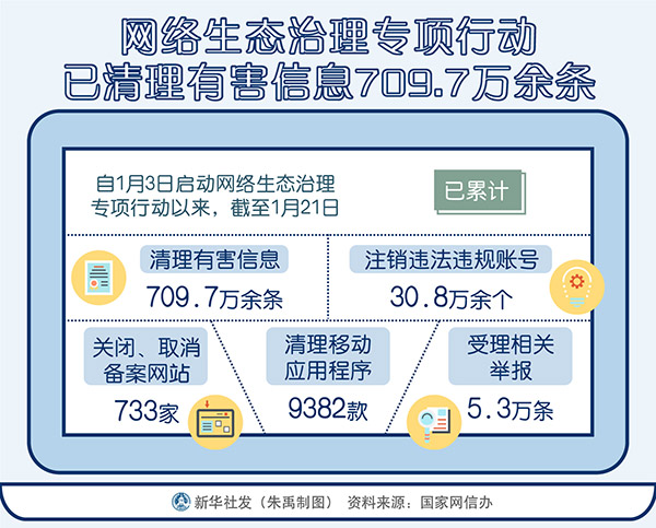 新華社北京1月23日電(記者史競(jìng)男、白瀛)記者23日從國(guó)家網(wǎng)信辦獲悉,自1月3日啟動(dòng)網(wǎng)絡(luò)生態(tài)治理專項(xiàng)行動(dòng)以來,截至1月21日,已累計(jì)清理有害信息709.7萬余條,注銷違法違規(guī)賬號(hào)30.8萬余個(gè),關(guān)閉、取消備案網(wǎng)站733家,清理移動(dòng)應(yīng)用程序9382款,受理相關(guān)舉報(bào)5.3萬條。