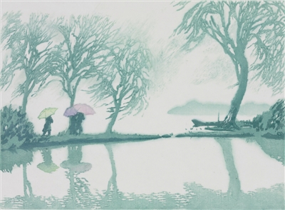 浙江美術(shù)館藏陸放版畫(huà)《西湖春雨》。