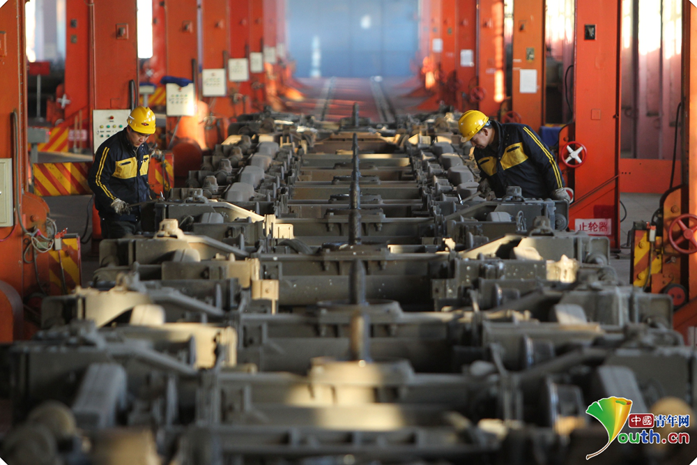 康亞斌和同事們所在的聯(lián)運檢修車間擔負著北京至烏蘭巴托、北京至莫斯科以及呼和浩特至烏蘭巴托等6趟國際旅客列車換輪任務(wù),還要對這些車輛重要部件進行定期檢修。