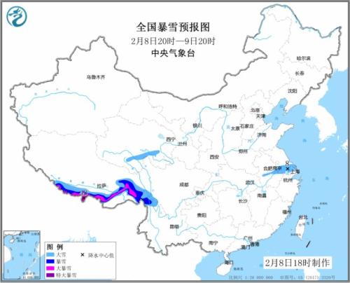2月8日20時(shí)至9日20時(shí),青藏高原東部和南部、甘肅中部和南部、蘇皖大部等地的部分地區(qū)有中到大雪或雨夾雪,其中,西藏南部和東部的部分地區(qū)有暴雪,局地有大暴雪或特大暴雪(30~40毫米)。西藏東南部、江南大部、西南地區(qū)東部和華南北部等地有小到中雨,其中,西藏東南部、云南西北部等地局地有大雨或暴雨(25~80毫米)。西藏中西部、華北北部、遼東半島、江漢、江南東北部等地的部分地區(qū)有4~6級(jí)風(fēng)。