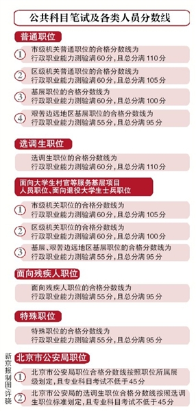 在日前公布的“京考”分數線中,市區兩級普通職位的合格分數線都要求行政職業能力測驗滿60分。市級普通職位總分要求滿110分,區級總分要求105分。分數線最低的是艱苦邊遠地區基層職位,其合格分數線為行政職業能力測驗滿55分,且總分滿95分。