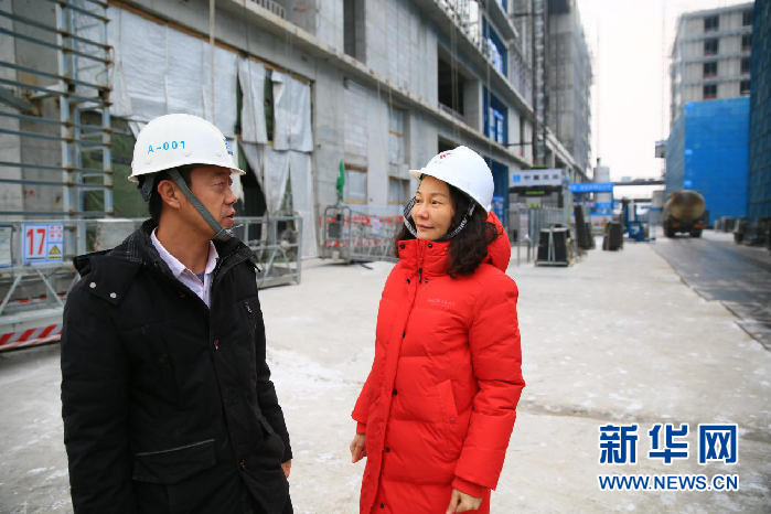 圖片說明:龍雪波向記者介紹,離竣工還剩136天,工人們以飽滿的精神努力工作。攝影:新華網錢春弦