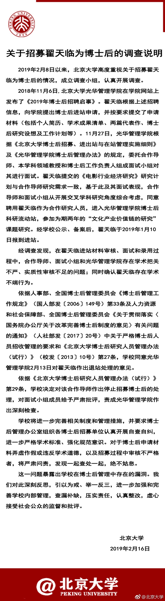 2月16日北京大學官方微博發布關于招募翟天臨為博士后的調查說明。