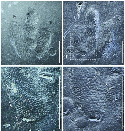 這些精致的小龍足跡一共有4個,組成了一道行跡,仿佛跨越了1億年的時空遇到人類。“小龍足跡僅在韓國和中國發現,是東亞白堊紀的特有足跡。這是世界上第10處發現有小龍足跡的化石點,也是首次發現這種足跡的皮膚印痕。”林鐘悳告訴記者。此前,古生物學家從未發現過有如此完美的皮膚印痕,足跡上的鱗片痕跡平均直徑還不到0.4毫米,而且不同于此前的鱗片印痕僅出現在足跡的部分區域,小龍足跡保存了整個腳底的皮膚。