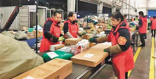 下圖 重慶市渝北區百世快遞重慶運轉中心內,工作人員在初步核驗快遞電子單。