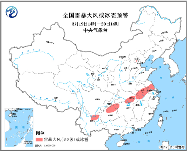 這次降雨過程中,會有明顯的雷電天氣。從19日夜間開始,河南南部、江蘇、安徽東北部、湖北北部、湖南西北部和貴州北部等地將先后出現雷電、短時強降水、雷暴大風和冰雹等強對流天氣。19日10時,中央氣象臺發布了強對流天氣藍色預警。