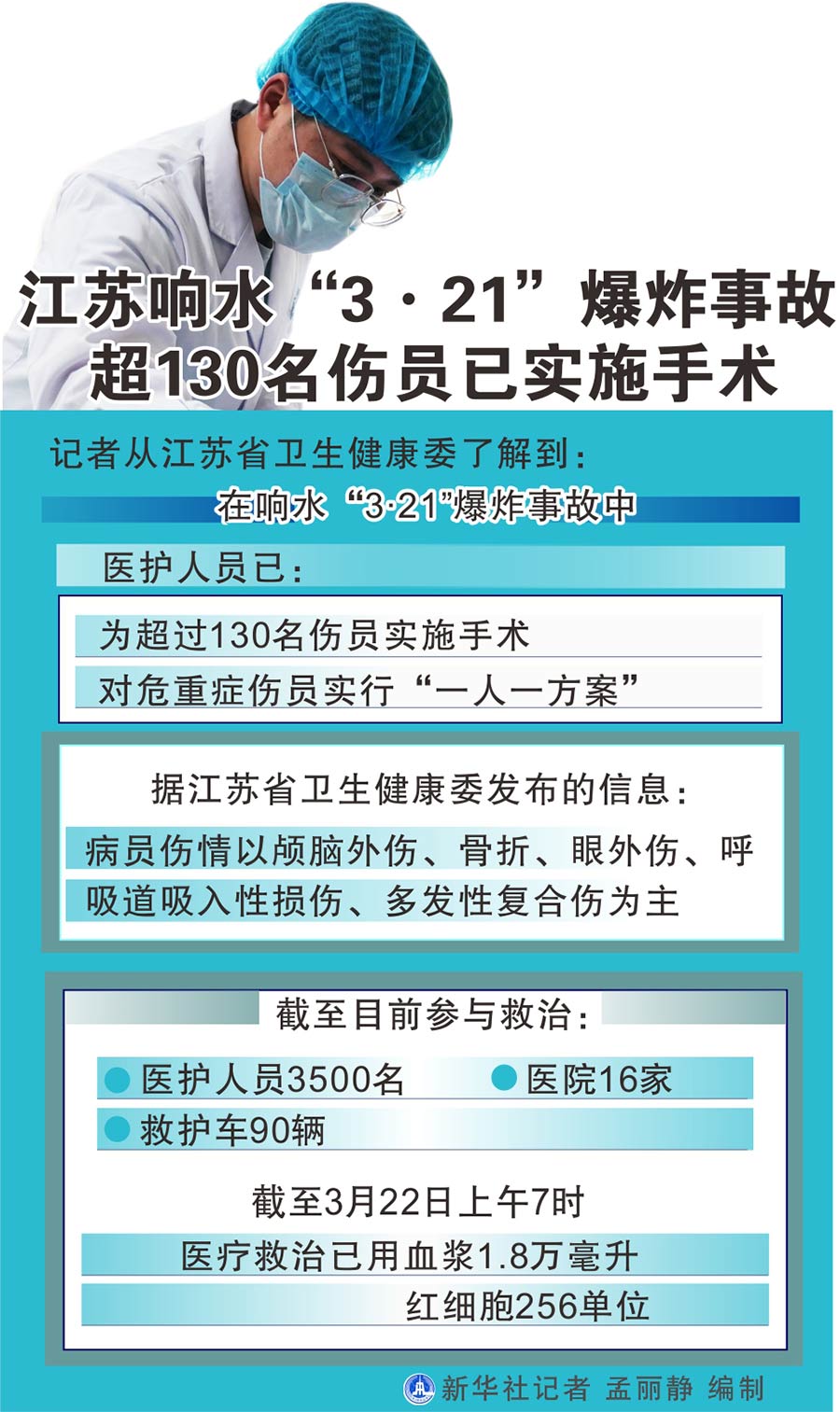圖表:江蘇響水“3·21”爆炸事故超130名傷員已實施手術 新華社記者 孟麗靜 編制