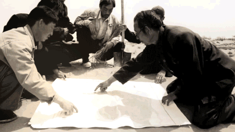 前圖為新華社2001年5月21日播發(fā)的新華社記者韓傳號(hào)拍攝的六老漢之一張潤(rùn)元(右一)等人研究八步沙規(guī)劃圖;后圖為八步沙第二代治沙人研究八步沙地圖(新華社記者 范培珅 攝)。