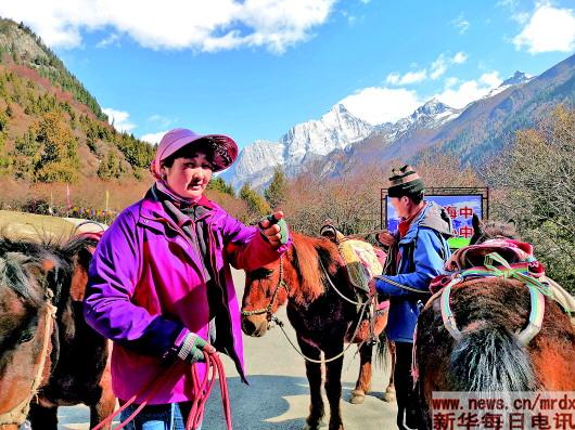 有“東方阿爾卑斯山”之稱的四姑娘山,位于四川阿壩藏族羌族自治州小金縣境內(nèi),與“大熊貓的故鄉(xiāng)”——臥龍自然保護(hù)區(qū)接壤。由于生態(tài)環(huán)境保護(hù)的特殊性,不少觀光地點(diǎn)車輛無法進(jìn)入,只能徒步穿越或者騎馬進(jìn)山,馬匹具有十分重要地位。“一開始,我一個(gè)人牽馬,沒有統(tǒng)一的組織和管理,一天有時(shí)候只能掙三四十元,有的游客還擔(dān)心是否安全,不敢坐。”扎西告訴記者,村里統(tǒng)一管理以后,村民接受了專業(yè)培訓(xùn)、收費(fèi)透明,選擇坐馬穿越長坪溝和海子溝的游客越來越多。如今,長坪村有牽馬師700余人,牽馬成為村民重要的收入來源。