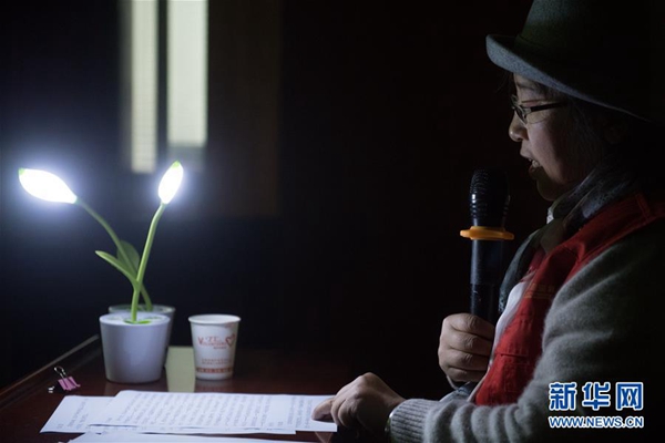 4月11日,吳素環在中國盲文圖書館桐廬縣支館為視障人士解說電影《可可西里》。新華社記者 翁忻旸 攝
