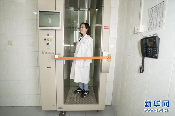 在中核集團中國原子能科學研究院,媒體記者在參觀完中國先進研究堆后,都要經過一個特別的安檢門,通過檢測確定沒有受到輻射污染才能夠離開(4月17日攝)。新華社記者 才揚 攝